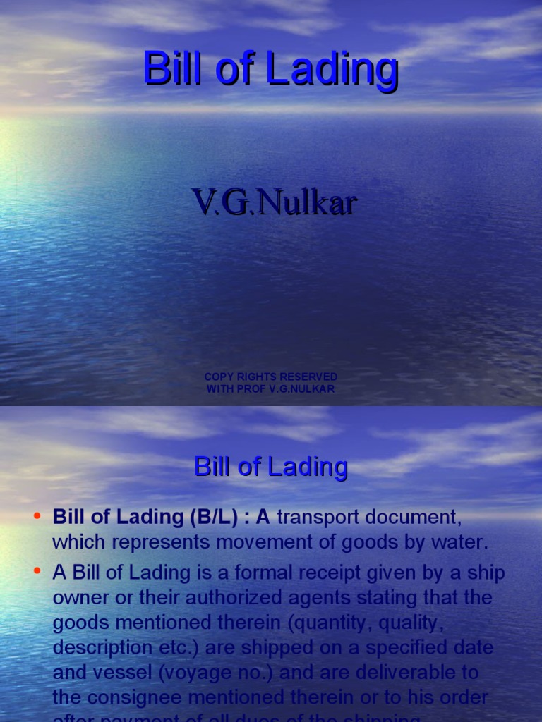 A standard charter party and bill of lading form used the grain trade. And canada to all parts of the world. Conference members often issue bills of lading for carriage on one another's ships. The lowest temperature at which a liquid gives off sufficient vapor to form a flammable mixture with air near the surface of the liquid. Experience of bill of lading issues both from claims handling as well as from dealing with member enquiries.